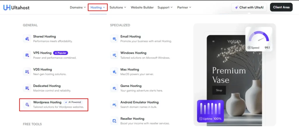 - قم بزيارة UltaHost من الصفحة الرئيسية، اختر استضافة ووردبريس.