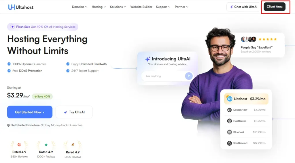 1. قم بالضغط على “Client Area” تسجيل دخول المستخدم، من الصفحة الرئيسية لموقع Ultahost. أقرأ أيضًا عن مراجعة Ultahost.