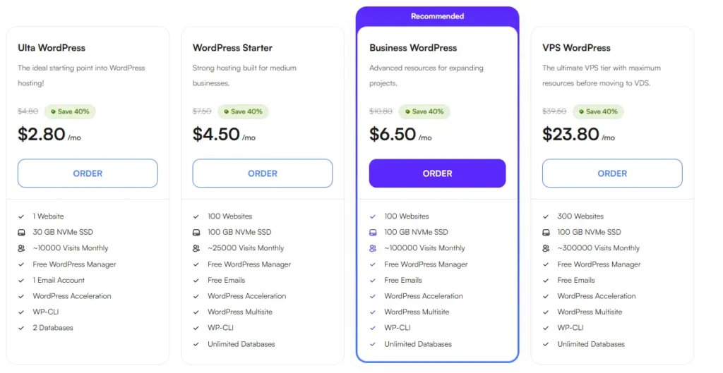 - قم باختيار أحد الخطط المعروضة أمامك في الصفحة التالية، عن طريق الضغط على “Order”؛ وبالنسبة للمبتدئين وأصحاب الشركات الصغيرة، يكون خيار ألتا ووردبريس مناسب. لأنها توفر كل ما يحتاجه المستخدم لبدء موقعه الإلكتروني بسهولة دون خبرة.
