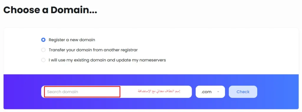 - إذا لم يكن لديك دومين سابق، قم بكتابة الاسم الذي ترغب به في مربع البحث، ثم اختيار الامتداد من القائمة سواء كان .com أو .net، أو غيرهم. بعد ذلك أنقر على “Check” لمعرفة ما إذا كان الاسم متاحًا. إذا كان متاحًا يمكنك تسجيله ليصبح اسم موقعك الرسمي، أما إذا كان مستخدمًا من قبل، فيمكنك تعديل الاسم أو اختيار امتداد مختلف.