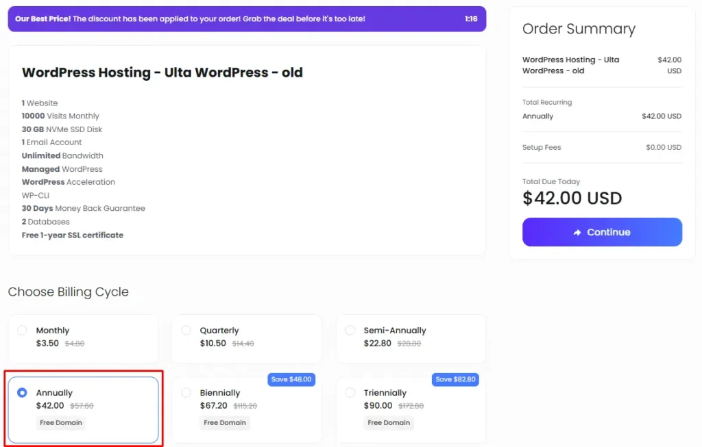 3. ستظهر أمامك هذه الصفحة، الجزء العلوي منها هو تأكيد لطلبك، ثم يليه خيار تحديد فترة الفوترة. فأنت كمبتدأ فالخيار الأول خيار ألتا ووردبريس مناسب. لأنها توفر كل ما يحتاجه المستخدم لبدء موقعه الإلكتروني بسهولة دون خبرة وبسعر رخيص.