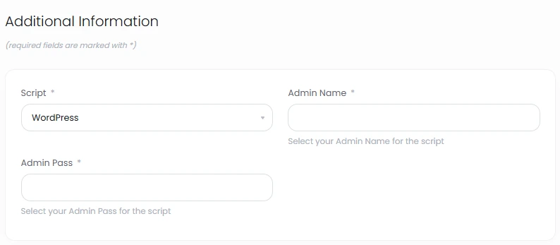 في الخانة الأولى Script، أختر WordPress، لأننا نرغب في إنشاء موقع إلكتروني باستخدام هذا النظام. ثم قم بكتابة اسم المستخدم في خانة Admin Name، ثم قم بكتابة كلمة مرور في Admin Pass.
