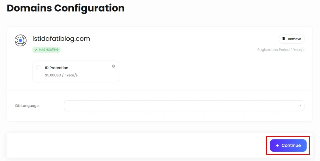 2. بعد الوصول إلى اسم النطاق، قم بالضغط على “Add to cart”، ثم “Continue”.