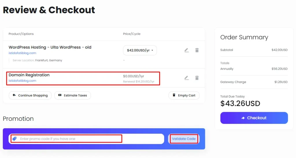 8. هنا تظهر تفاصيل تكلفة شراء الاستضافة والدومين، بالإضافة إلى رسوم بوابة الدفع، وأيضا هناك خانة خاصة برمز الخصم بحيث يمكنك إدخال كلمة ISTIDAFATI في الخانة وستحصل على تخفيض من سعر الإستضافة، بع ذلك اضغط على “Checkout” لإتمام عملية الدفع.